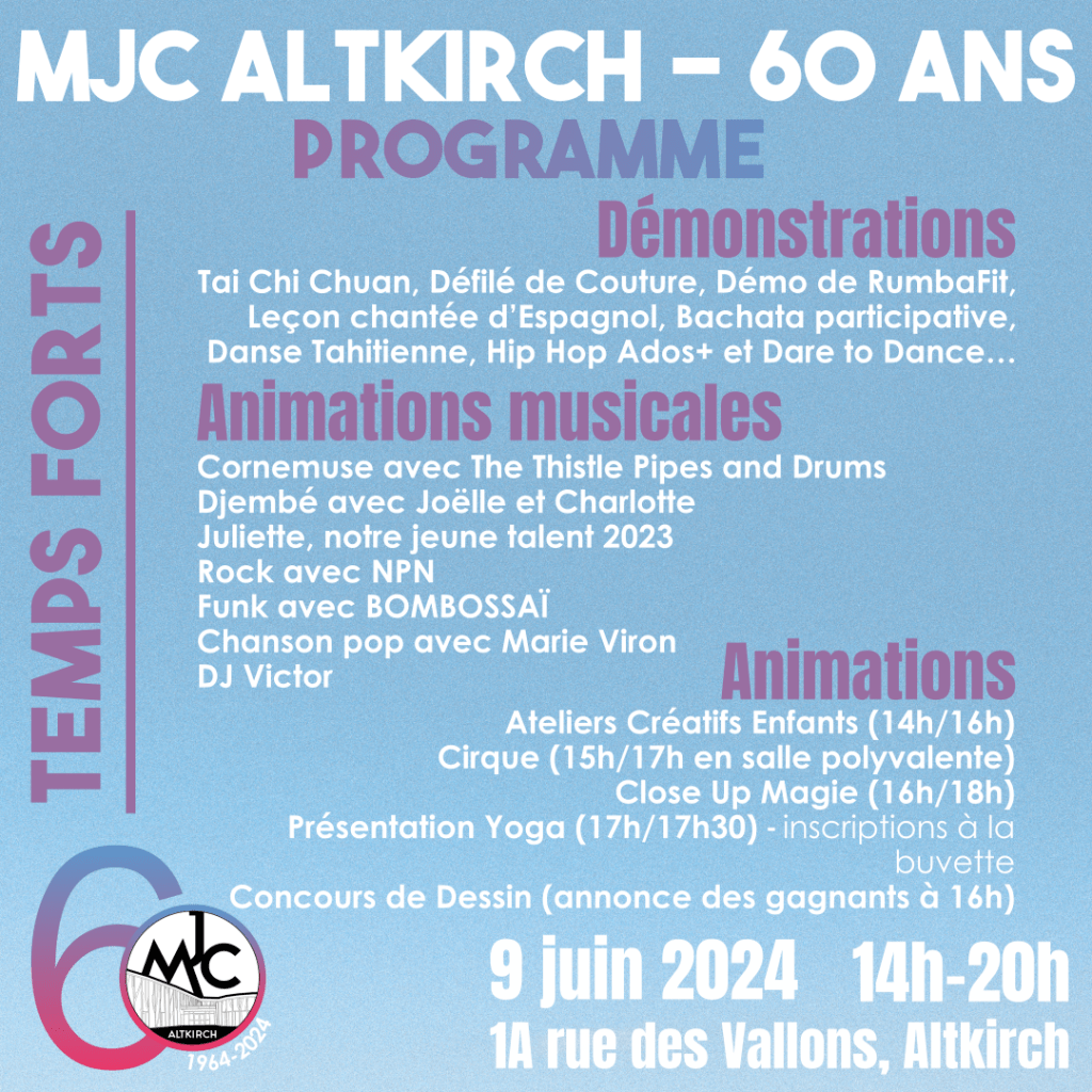 La MJC d’Altkirch a fêté son soixantième printemps lors d’une grande fête à L’Agora, le dimanche 9 juin 2024, à partir de 14h !